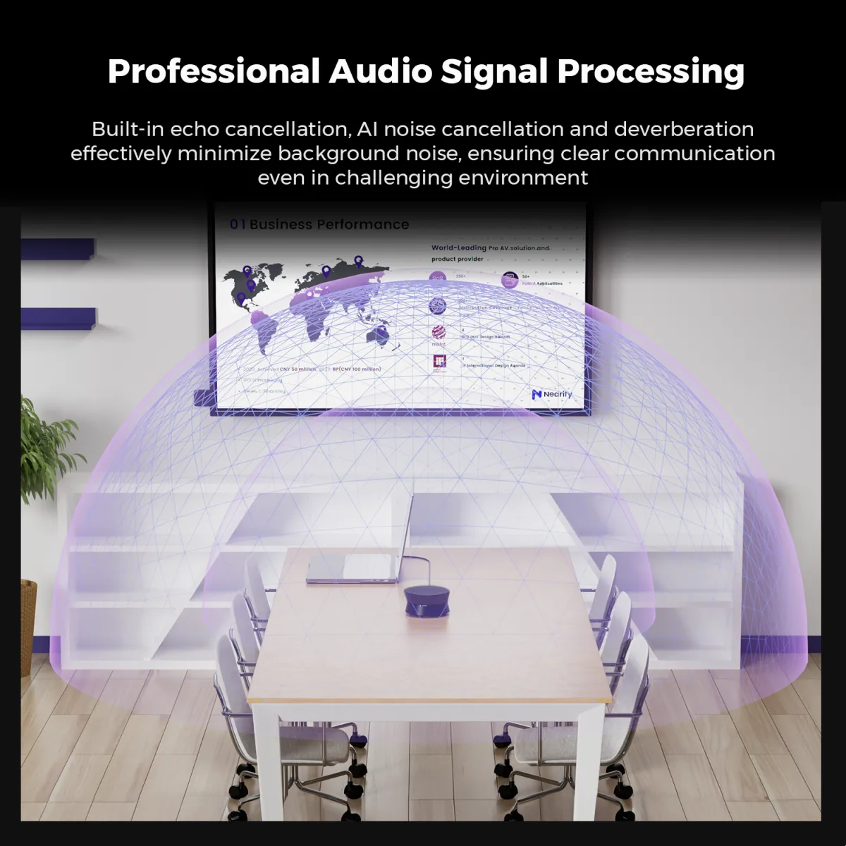 Nearity A22 là loa hội nghị USB tích hợp micro hiện đại, được thiết kế tối ưu cho các phòng họp vừa. Thiết bị hỗ trợ kết nối daisy chain lên đến 3 chiếc, mở rộng phạm vi phục vụ linh hoạt. Với 6 micro MEMS đa hướng, công nghệ AI khử ồn, chống vọng, giảm dội âm, A22 mang lại âm thanh trong trẻo, giúp các cuộc họp trực tuyến rõ ràng như họp trực tiếp.