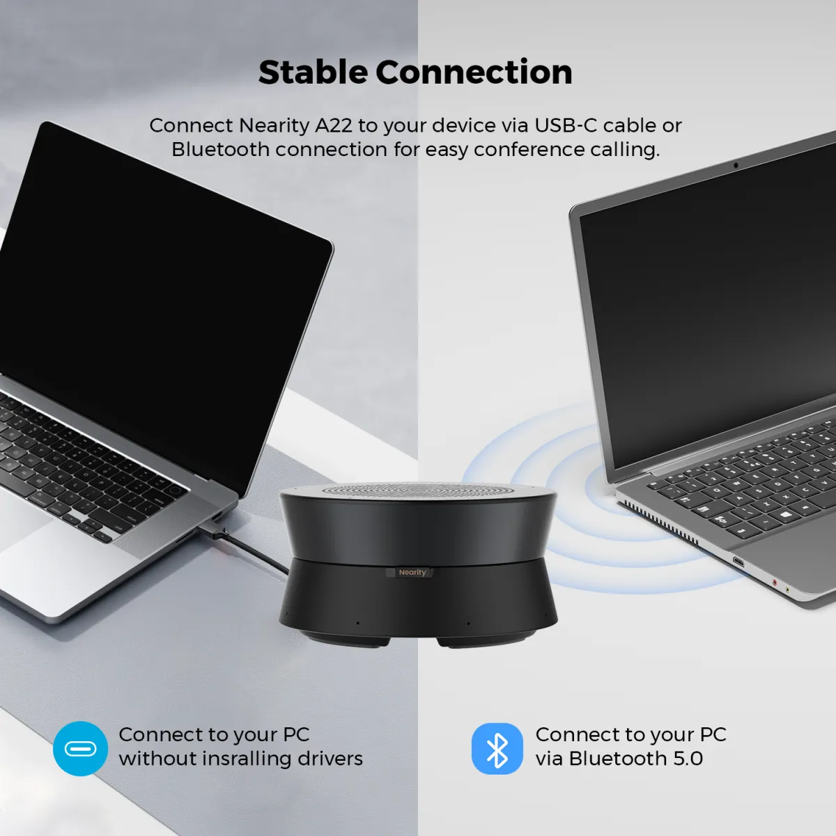 Nearity A22 Bluetooth Conference Speakerphone là thiết bị speakermic cao cấp hỗ trợ cả kết nối USB và Bluetooth, cho phép họp nhóm linh hoạt qua laptop hoặc điện thoại.