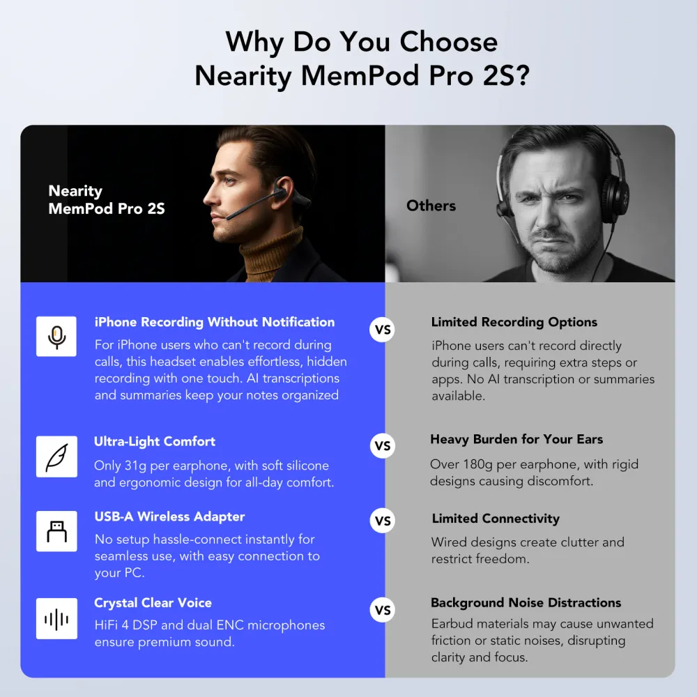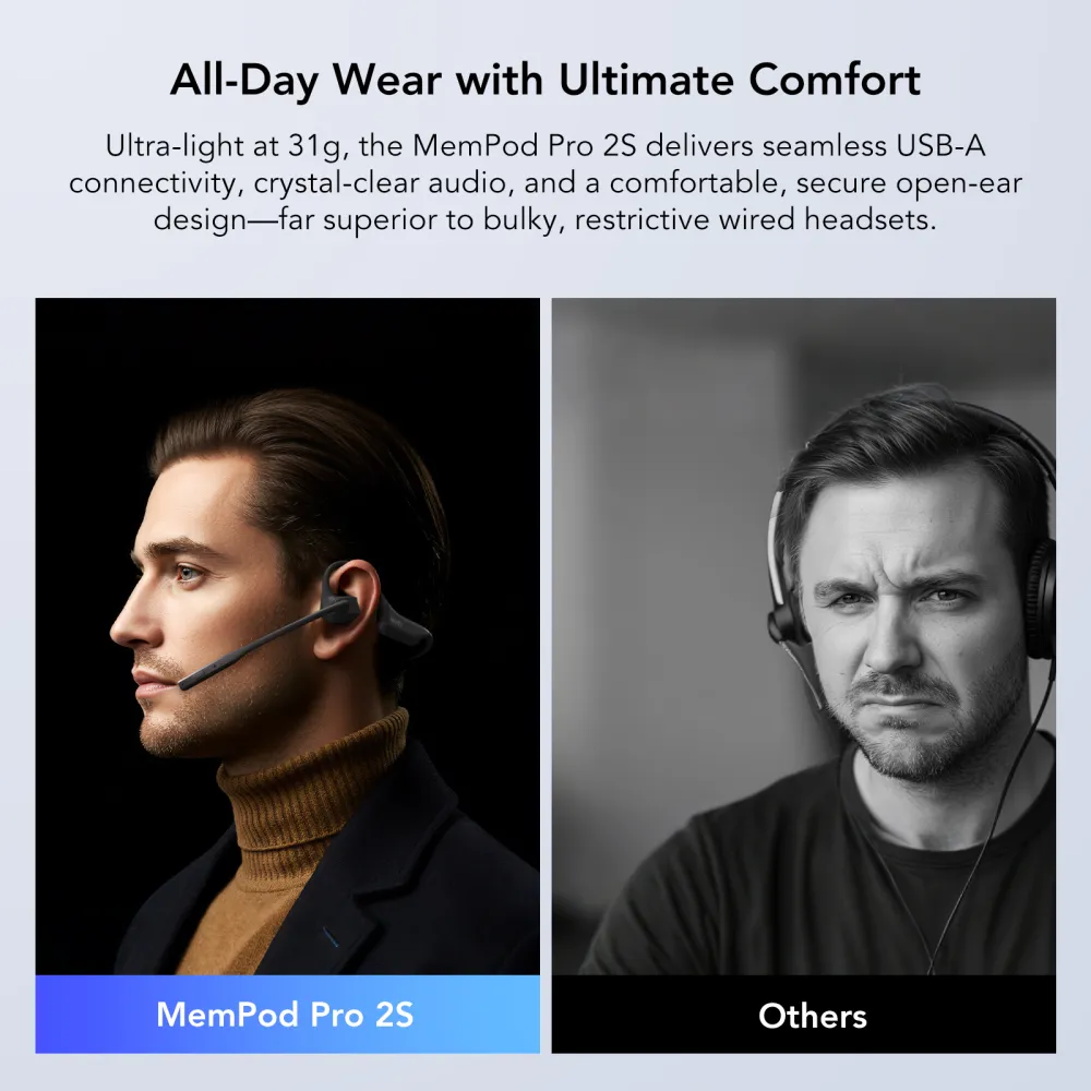 Nearity MemPod Pro 2S là tai nghe open-ear chuyên dụng cho văn phòng, call center hoặc học trực tuyến. Thiết bị nổi bật với micro array toàn hướng sử dụng công nghệ AI-Powered ENC kết hợp bộ xử lý HiFi-4 DSP, giúp lọc tiếng ồn tối ưu, cho giọng nói luôn trong trẻo và rõ ràng