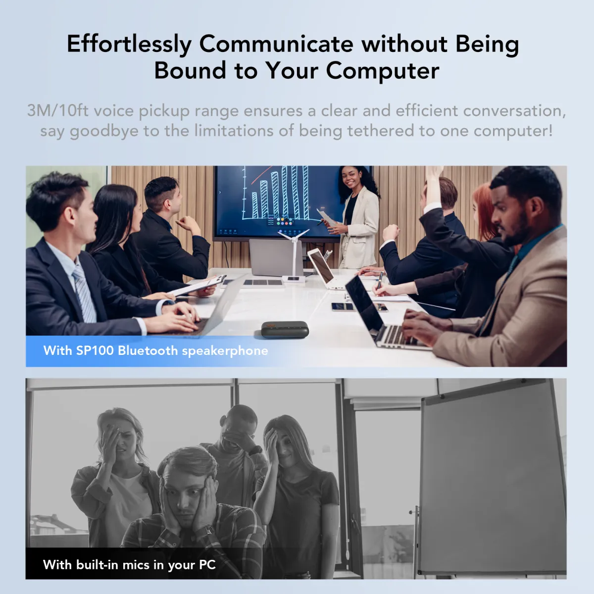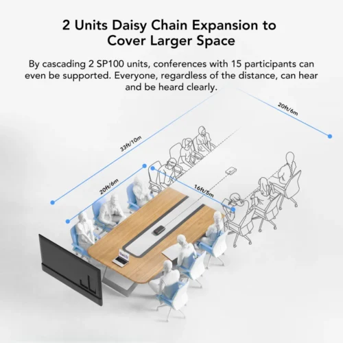 Trong các cuộc họp lớn hơn, bạn có thể kết nối hai SP100 với nhau (daisy-chain) để phục vụ tới 20 người, mang lại trải nghiệm hội nghị linh hoạt và hiệu quả.